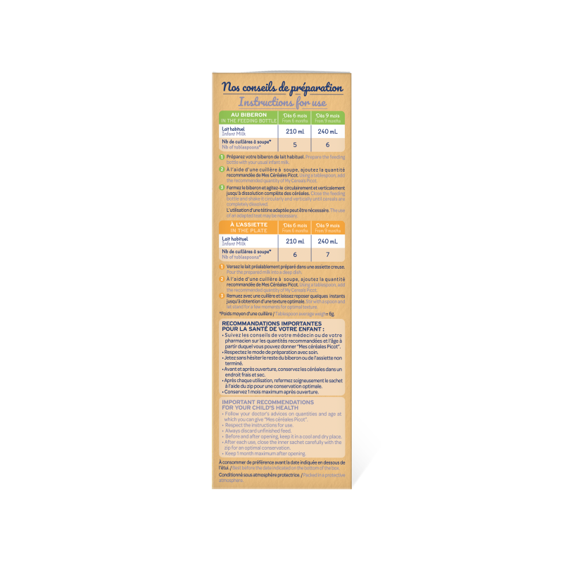 - Suivez les conseils de votre médecin ou de votre pharmacien sur les quantités recommandées et l'âge à partir duquel vous pouvez donner "Mes Céréales Picot".