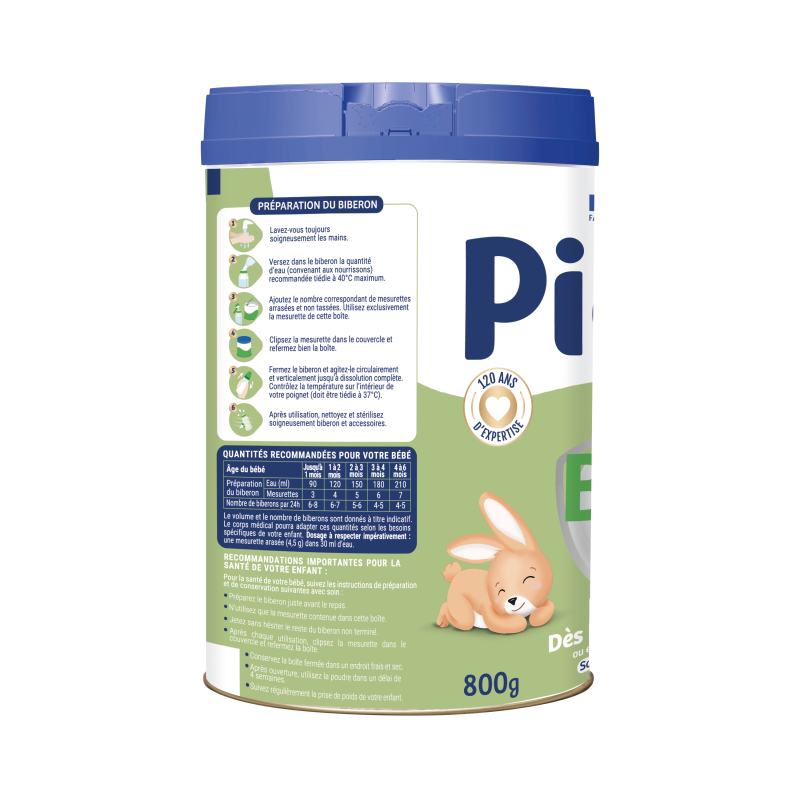 Préparez le biberon juste avant le repas. Une fois reconstitué, le lait devient un milieu fragile, il est donc important de ne pas conserver ni réutiliser le lait restant d’un biberon non terminé. Jetez-le sans hésiter. N’utilisez que la mesurette contenue dans cette boîte. Ne jamais remettre une mesurette humide dans la poudre. Après chaque utilisation, bien refermer la boîte avec le couvercle. Conservez au frais et au sec. Utilisez le contenu dans les 4 semaines après ouverture. Pour la santé de votre bébé, suivez les instructions de préparation et de conservation avec soin.
