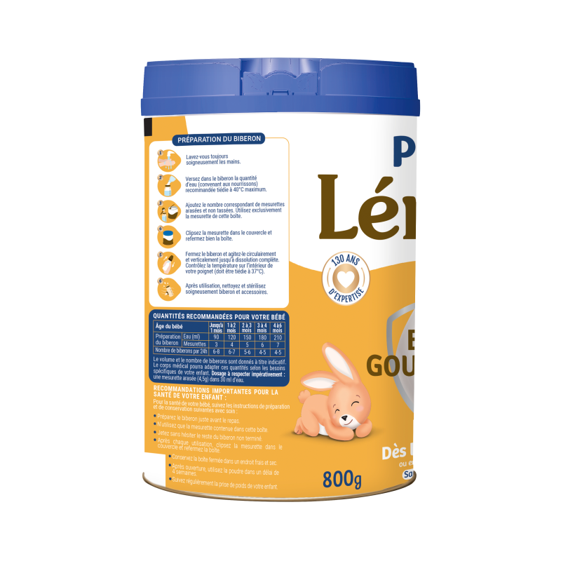 Préparez le biberon juste avant le repas. Une fois reconstitué,le lait devient un milieu fragile, il est donc important de ne pas conserver ni réutiliser le lait restant d’un biberon non terminé. Jetez-le sans hésiter. N’utilisez que la mesurette contenue dans cette boîte. Ne jamais remettre une mesurette humide dans la poudre. Après chaque utilisation, bien refermer la boîte avec le couvercle. Conservez au frais et au sec. Utilisez le contenu dans les 4 semaines après ouverture. Pour la santé de votre bébé, suivez les instructions de préparation et de conservation avec soin.