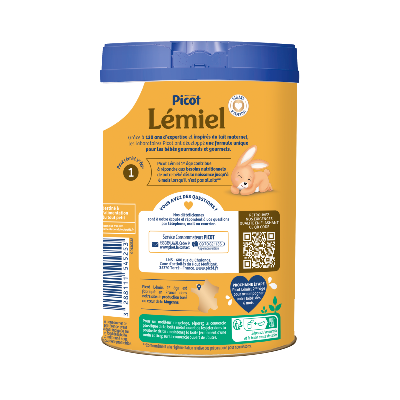 Découvrez Picot Lémiel 1, une formule de lait bébé épaissi pour les bébés gourmands et gourmets de 0 à 6 mois.