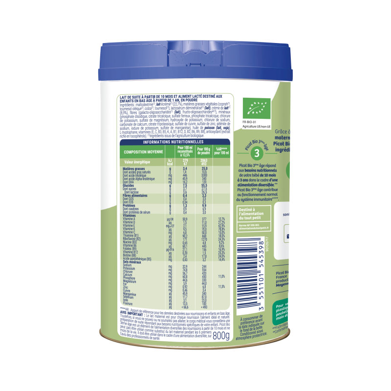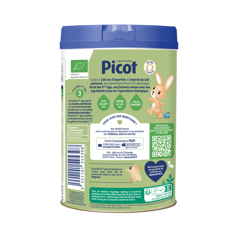 Découvrez Picot Bio 3ème âge, une formule qui répond aux besoins nutritionnels de votre bébé de 10 mois à 3 ans dans le cadre d'une alimentation diversifiée.* Picot Bio 3ème âge contribue au fonctionnement normal du système immunitaire.**