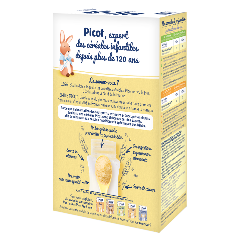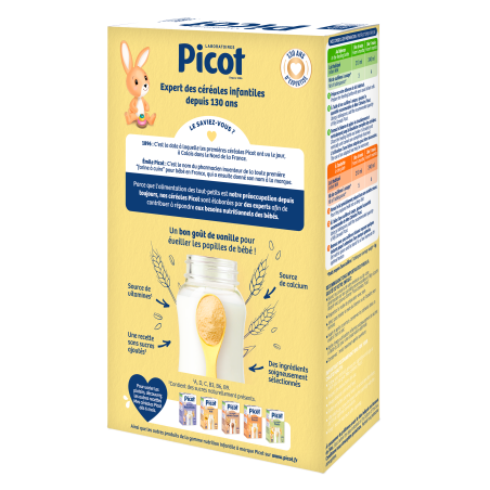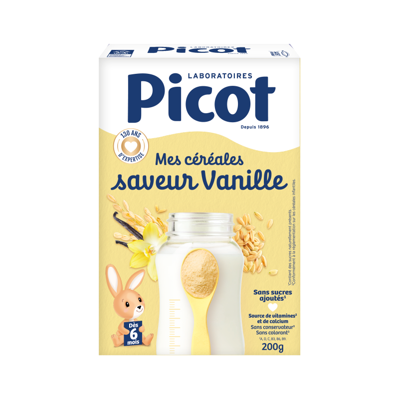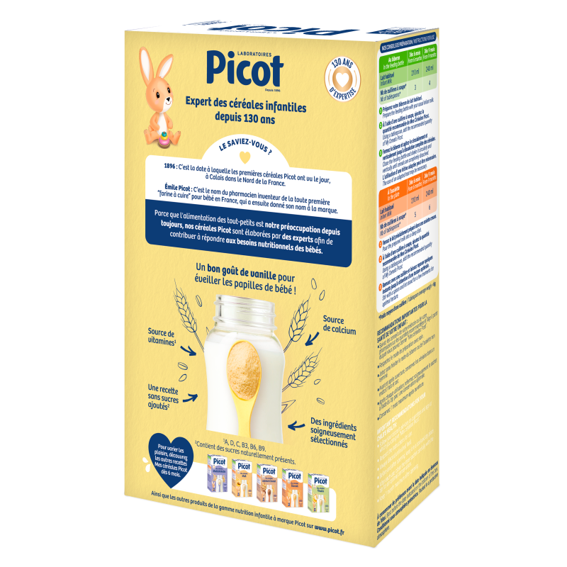 Nos céréales Picot saveur vanille sont élaborées par des experts afin de répondre aux besoins nutritionnels spécifiques des bébés.