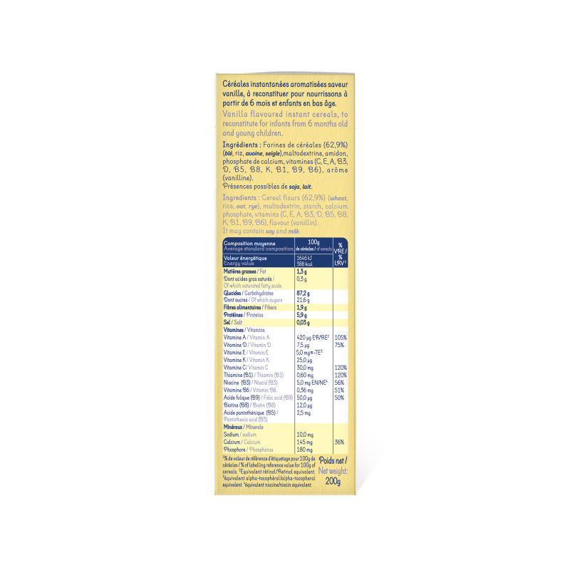 Farines de céréales (62,9%) (blé, riz, avoine, seigle), maltodextrine, amidon, phosphate de calcium, vitamines (C, E, A, B3, D, B5, B8, K, B1, B9, B6), arôme (vanilline).Â