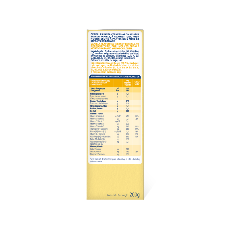 Céréales instantanées vanille, aromatisées, à reconstituer, pour nourrissons à partir de 6 mois et enfants en bas âge.